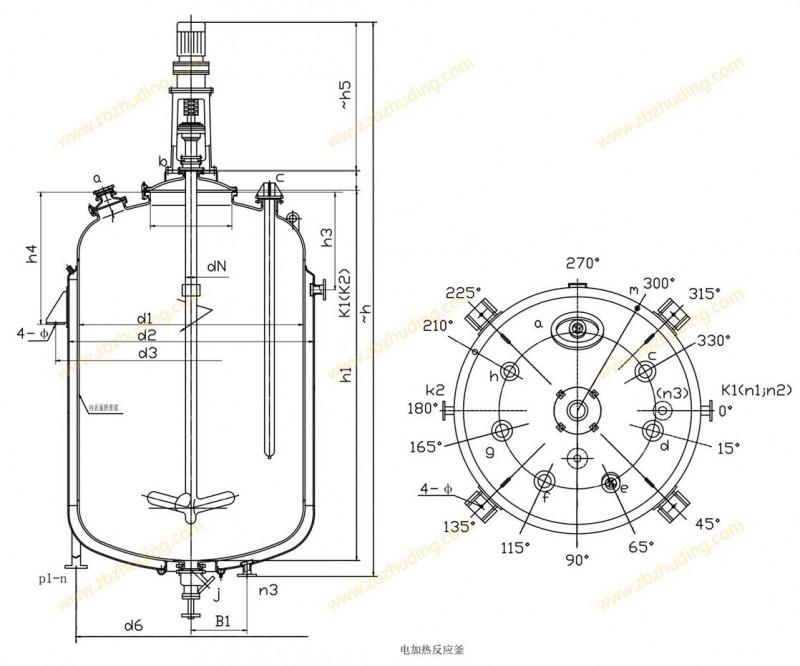 K50L-K5000L电加热搪玻璃反应釜(电加热搪瓷反应釜)设计图纸及参数如下所示: