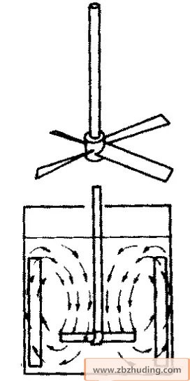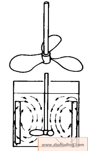 流体流动方向平行于搅拌轴,流体由桨叶推动,使流体向下流动,遇到容器底面再向上翻,形成上下循环流。